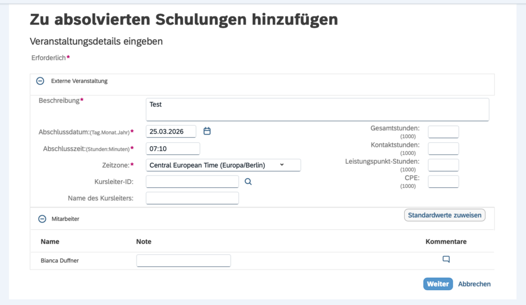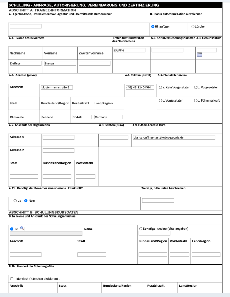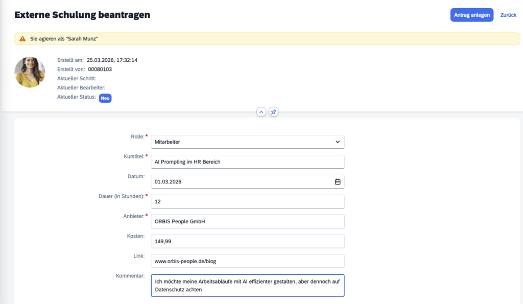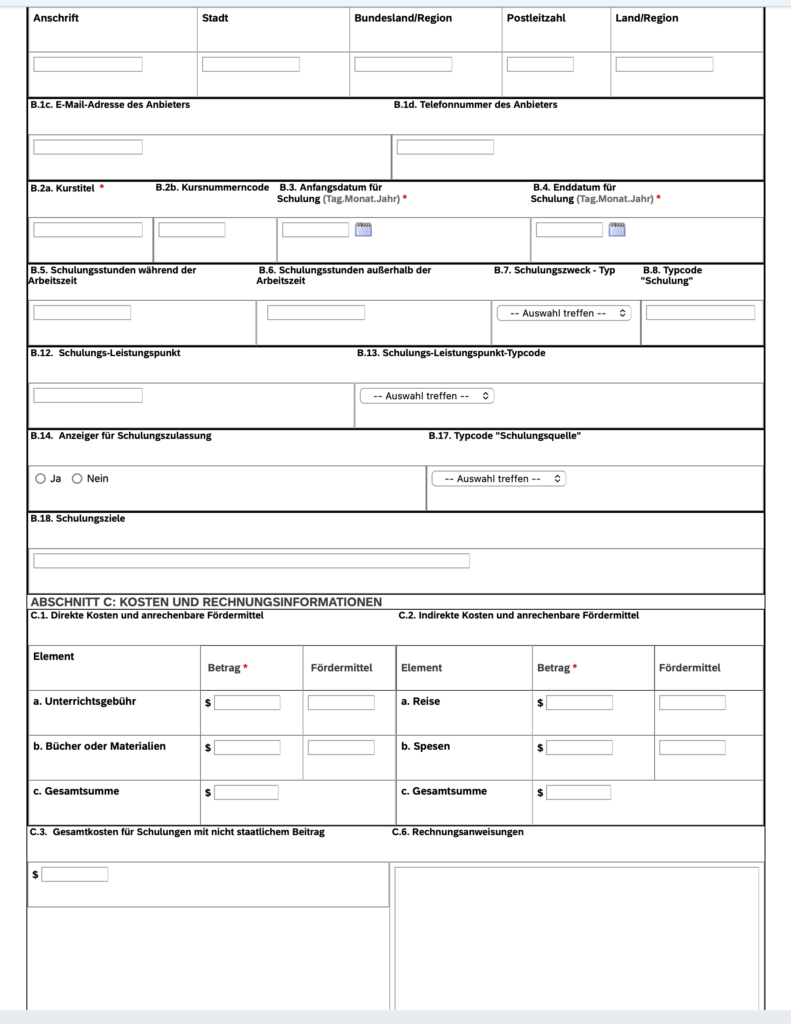 Aus dieser Oberfläche heraus besteht die Möglichkeit, einen weiteren Antrag auf externe Schulungsmaßnahme anzulegen. Das hier gezeigte Formular ist flexibel anpassbar: