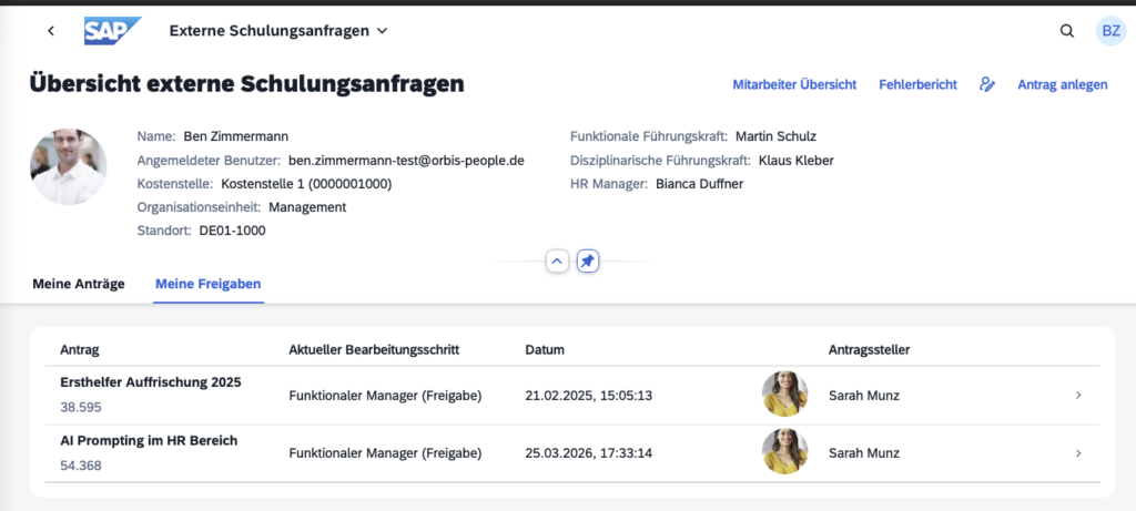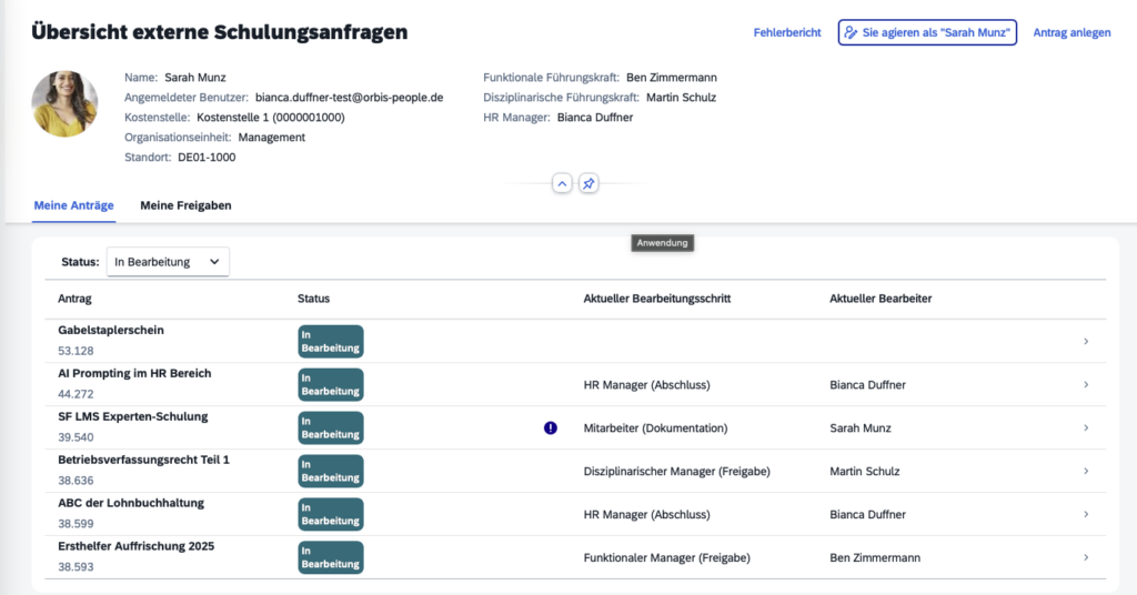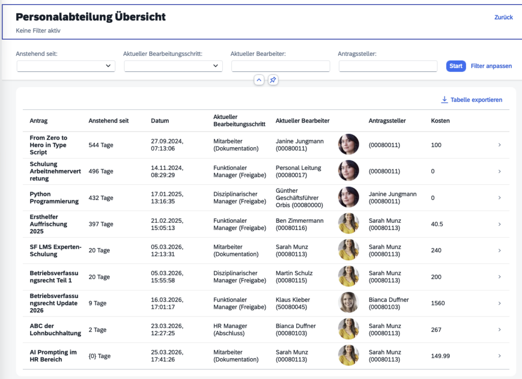 Um größtmögliche Transparenz über laufende Anträge zu ermöglichen, wird für HR als auch Führungskräfte eine Reporting Möglichkeit bereitgestellt. Hier ist der Status laufender Anträge und auch die Historie absolvierter Schulungen einsehbar.
