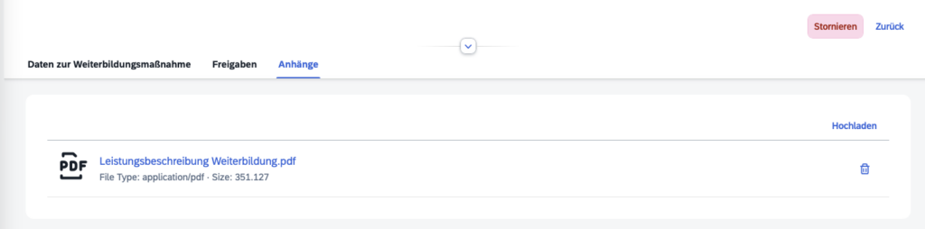Zu einer beantragten Schulung können Anhänge hinzugefügt werden (bspw. die Leistungsbeschreibung des Schulungsanbieters).