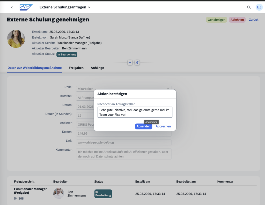 - Deeplink, der die Freigebenden direkt zum Schulungsantrag mit Freigabeoptionen führt