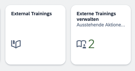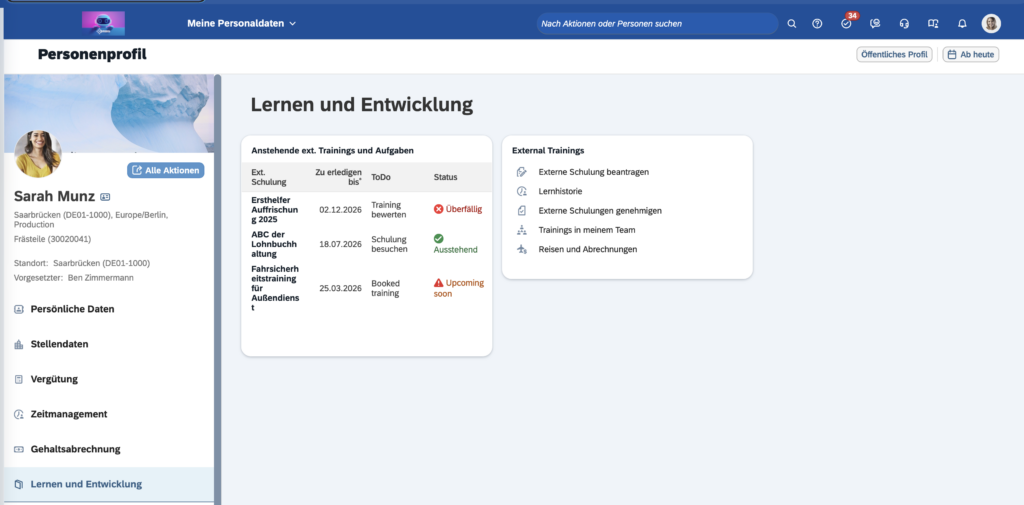 - Über eine UI Integration Card können Information aus der App direkt im People Profile angezeigt werden. Hier sind die Schulungsdaten für Führungskräfte sowie Mitarbeitende direkt sichtbar. Quicklinks erlauben den Absprung zu konkreten Funktionen, wie bspw. Freigaben oder der eigenen Lernhistorie.