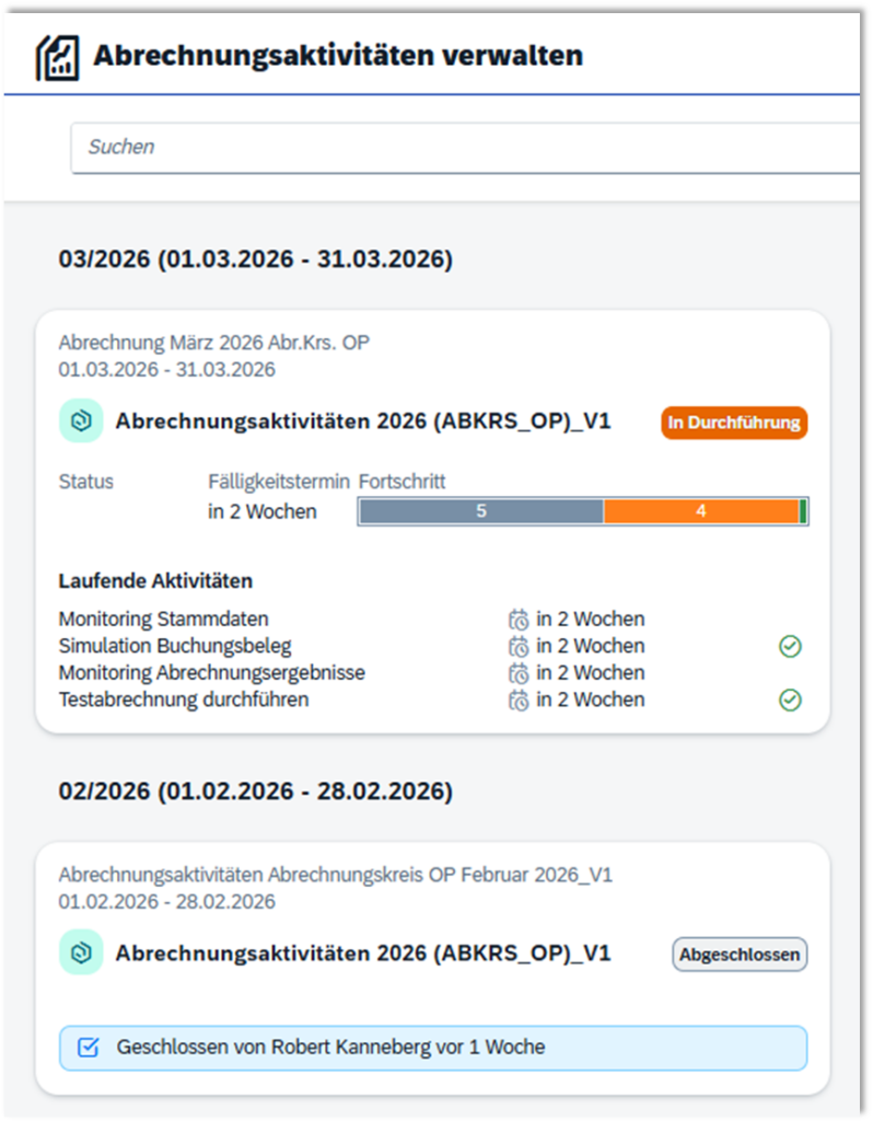 Im Bereich „Abrechnungsaktivitäten verwalten“ werden die wichtigsten Informationen zum aktuellen Prozessstatus kompakt dargestellt:
