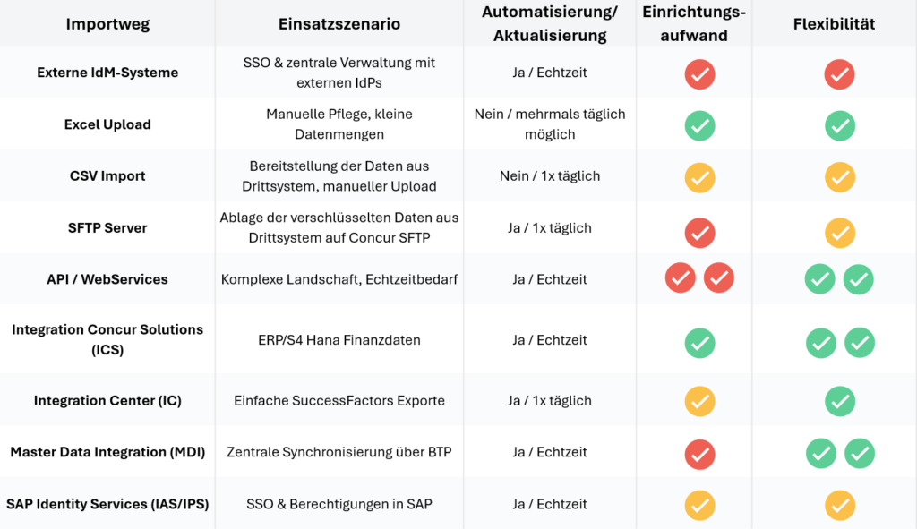 Je nach Systemlandschaft gibt es mehrere Wege, wie sich Mitarbeiterdaten in Concur importieren lassen: von einfachen Datei-Uploads über SFTP-Transfers bis hin zu API-Integrationen oder neuen Plattform-Ansätzen wie SAP Master Data Integration (MDI).
