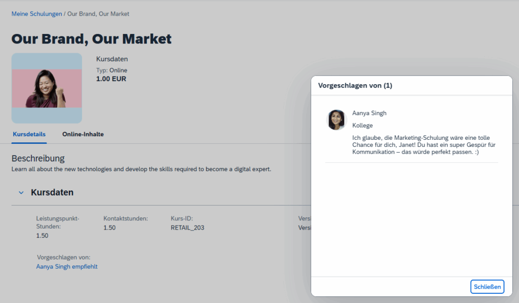 Empfehlungen sind eine wunderbare Möglichkeit, Ihre Kollegen und Kolleginnen über interessante Kurse zu informieren. Jetzt können Sie bei einer Empfehlung einen persönlichen Kommentar hinzufügen, der beispielsweise die Hintergründe Ihrer Empfehlung näher erläutert. Dies hilft demjenigen, der die Empfehlung erhalten hat, diese einzuordnen und ggf. zu priorisieren.