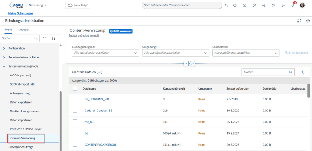 Ein absolutes Highlight für Administratoren stellt die Verfügbarkeit des iContent Managers direkt in der Schulungsadministration dar. Dessen Inhalte waren zuvor nur direkt auf dem iContent Server einsehbar. Nun kann man direkt aus der Schulungsadministration heraus die Ordner einsehen und bearbeiten. Aus Sicherheitsgründen können Inhalte jedoch nur vom Produktivsystem heraus gelöscht werden. Administratoren, die diese Funktion nutzen wollen, benötigen für diese Funktionalität eine Anpassung ihrer Berechtigungsrolle.